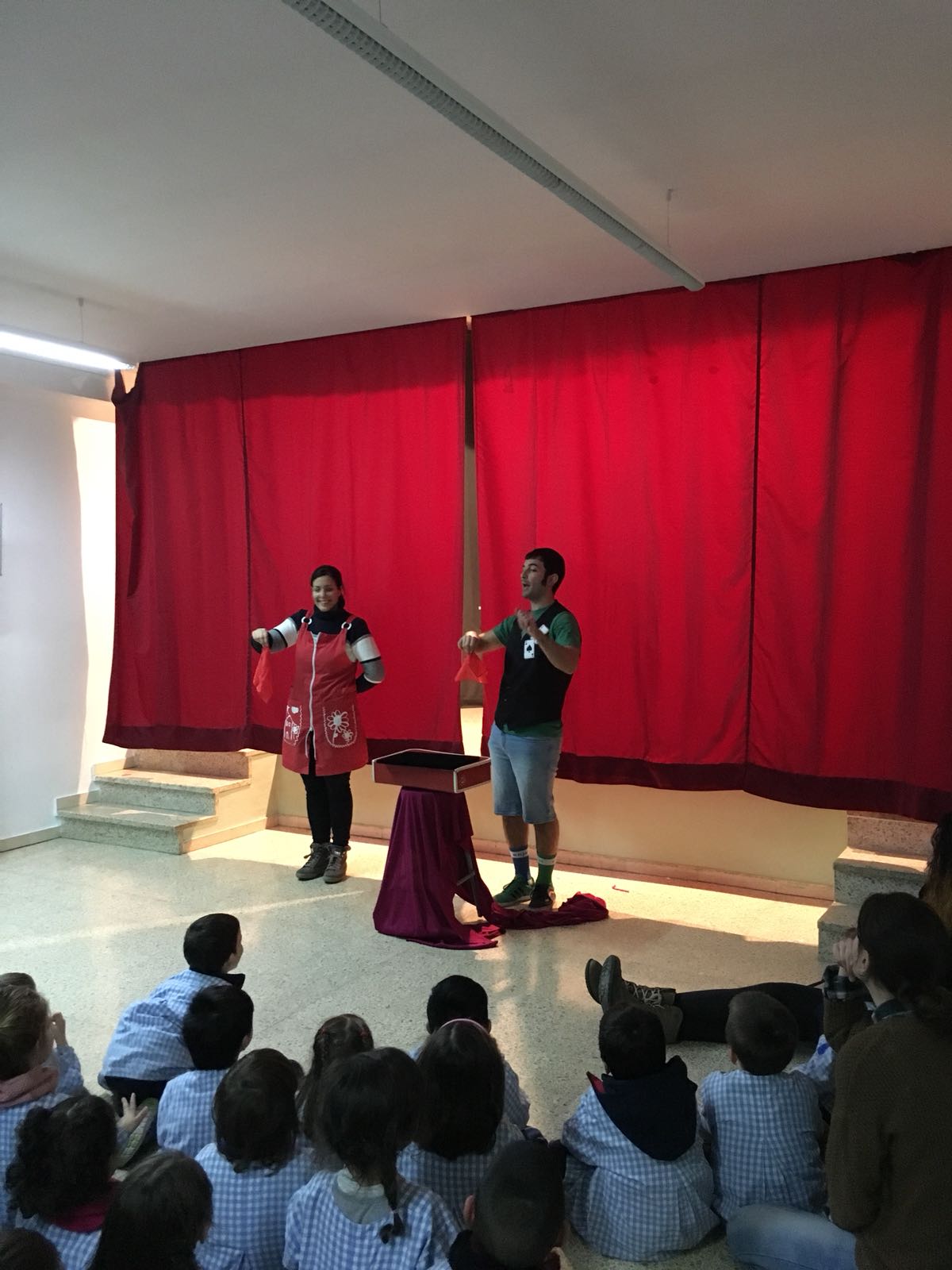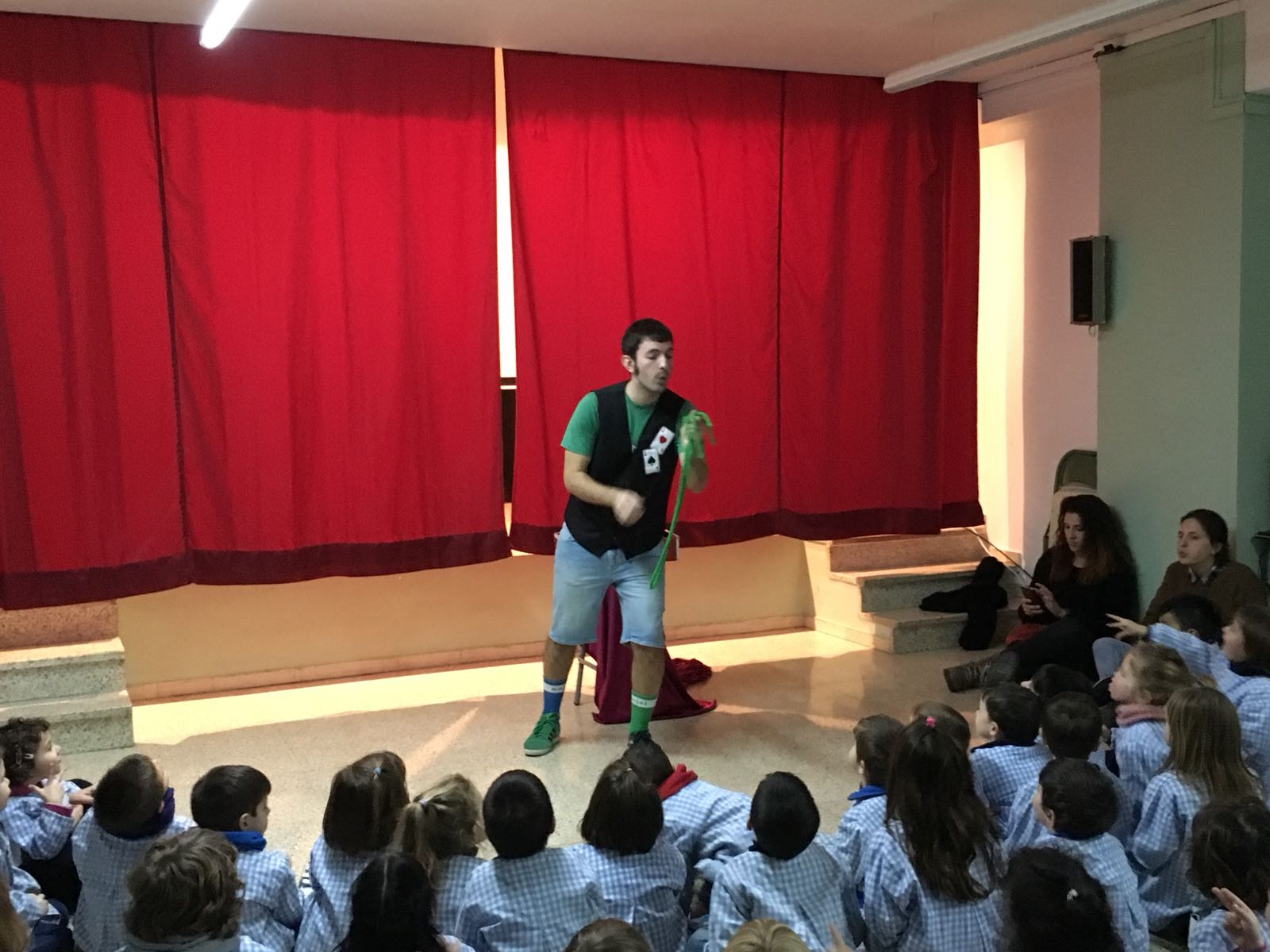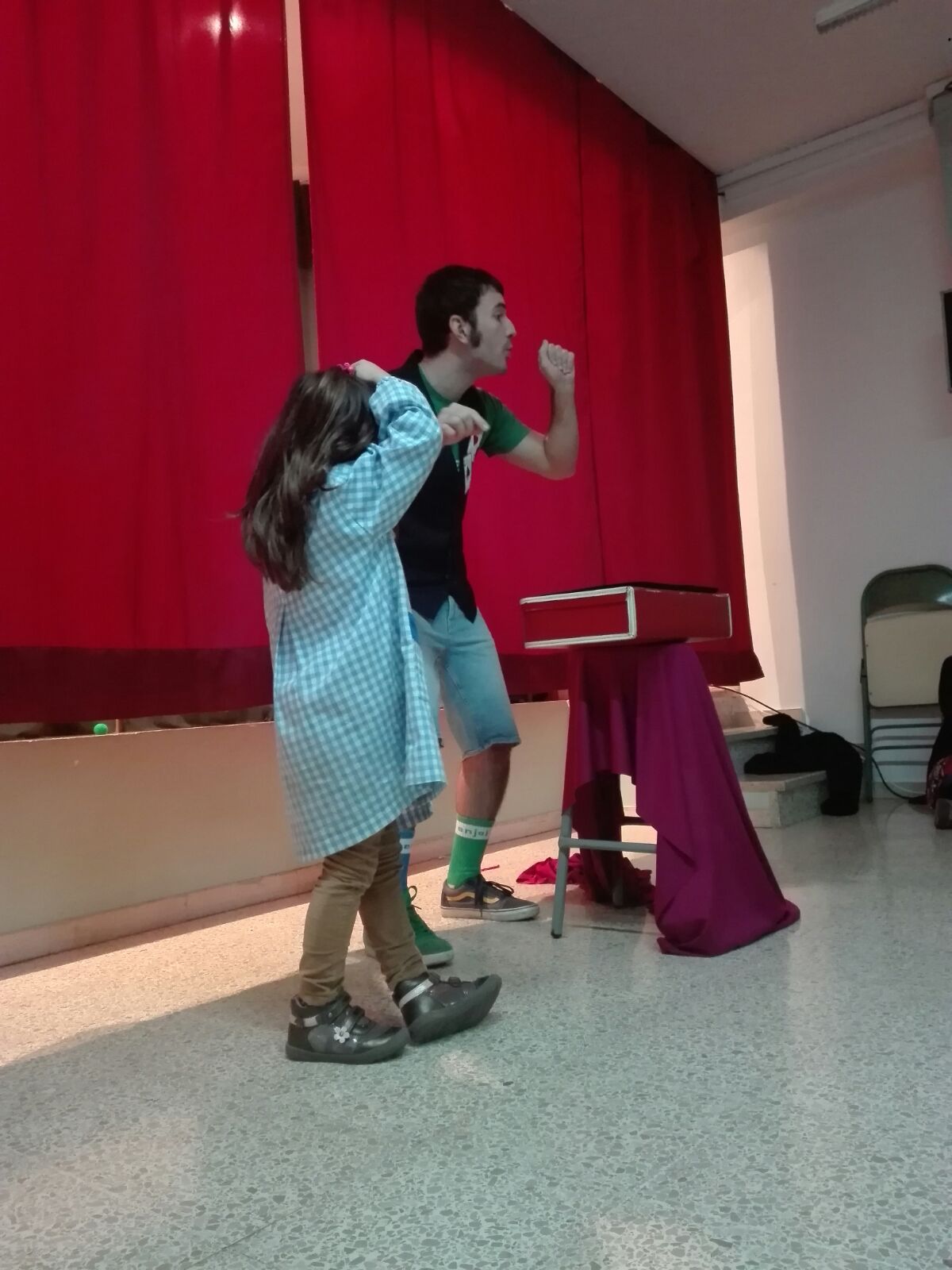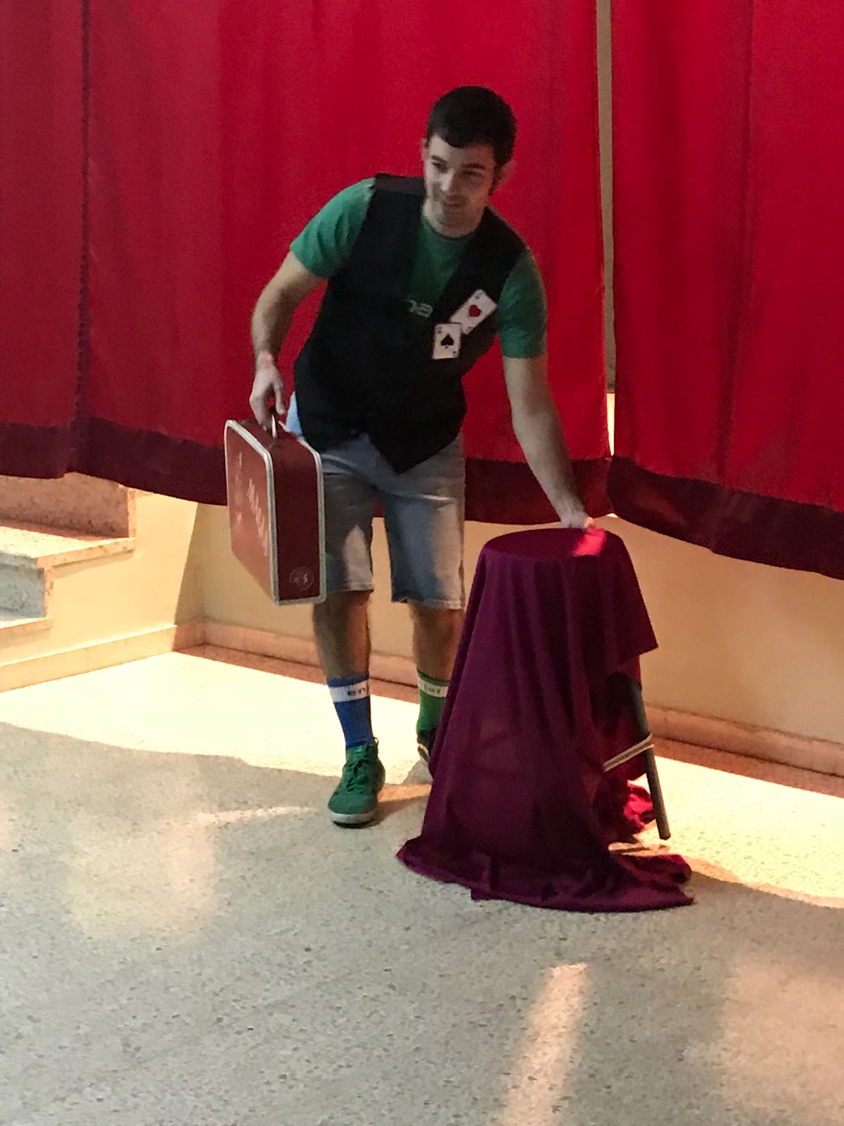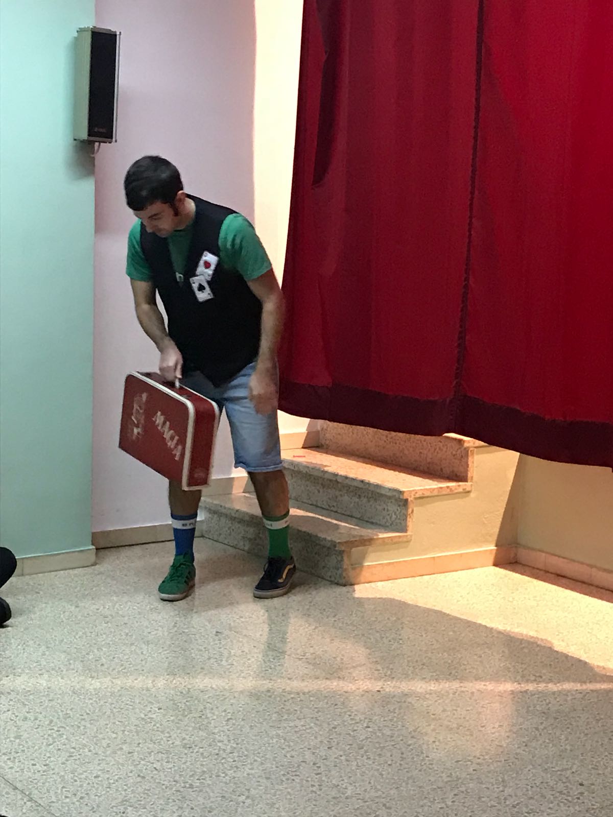 Cuando estaban las 3 clases de infantil (P3-4-5) sentadas, aparecí por un lateral del escenario, dispuesto a hacer las delicias de un público entregado, pero ¡HORROR! ¡Mi maleta de magia tenía vergüenza y no se quería mover! Suerte que los niños la saludaron y se le pasó; así que pudimos empezar el show.