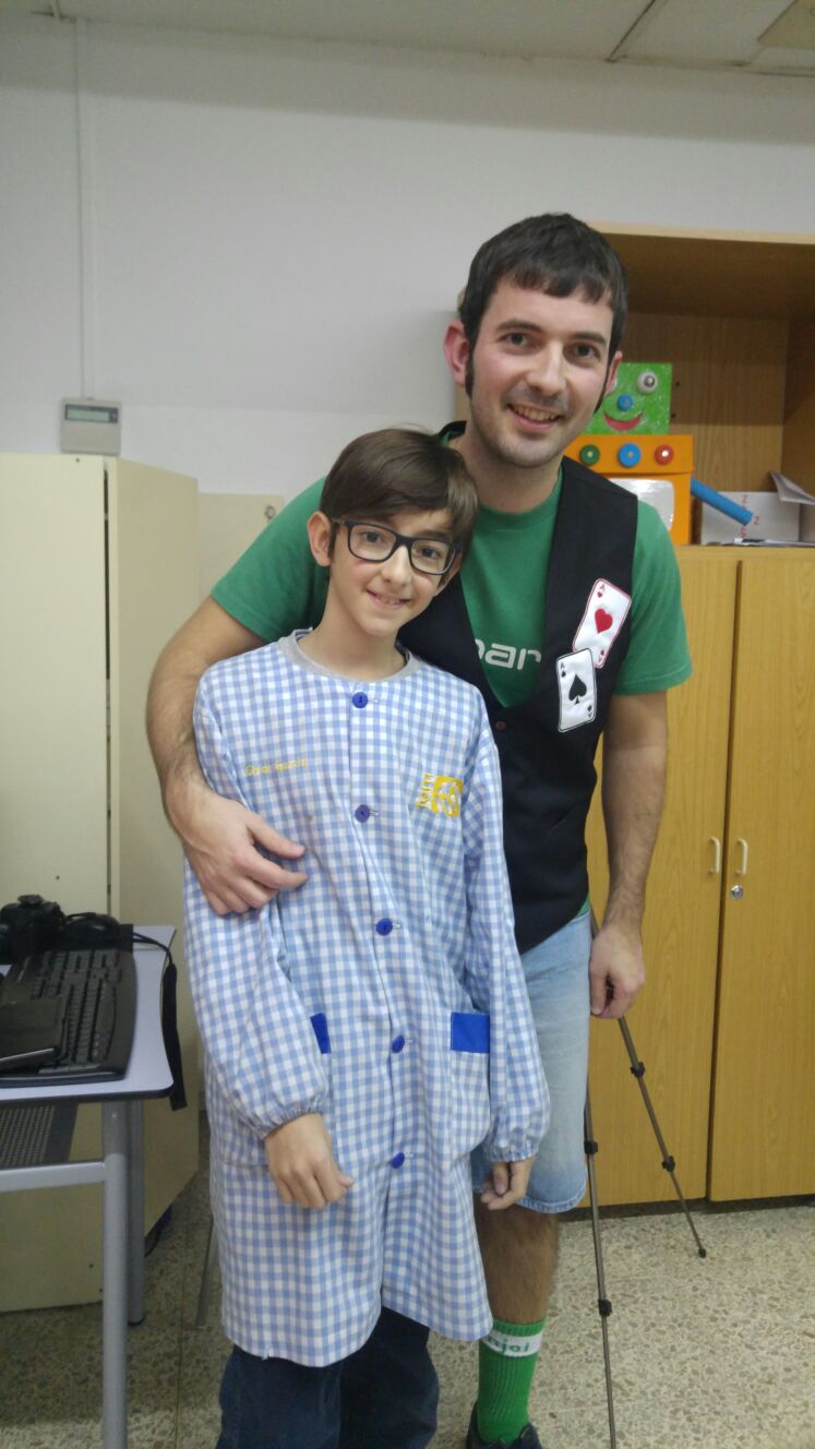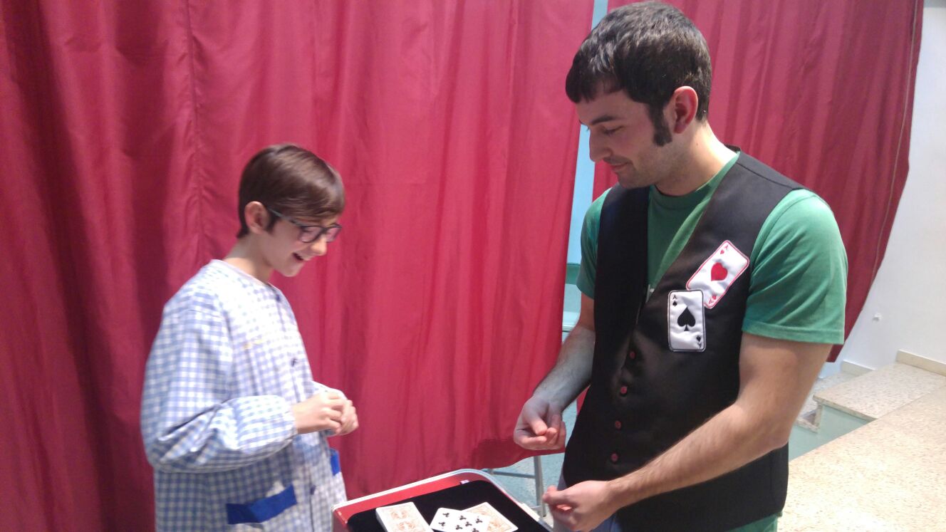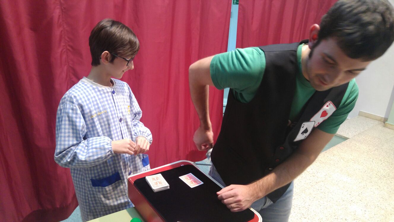 Cuando ya estaba recogiendo, apareció un niño, este ya un poco más mayor. Era el hijo de mi antiguo profesor de informática. “Que me había visto por youtube y que su padre decía que me conocía… “Así que puedo decir que más o menos conocí a “mi primer fan”. Cuando los peques se habían marchado me quedé con él a hacerle un poco de magia con cartas y esponjas. Él lo disfrutó mucho y yo también.